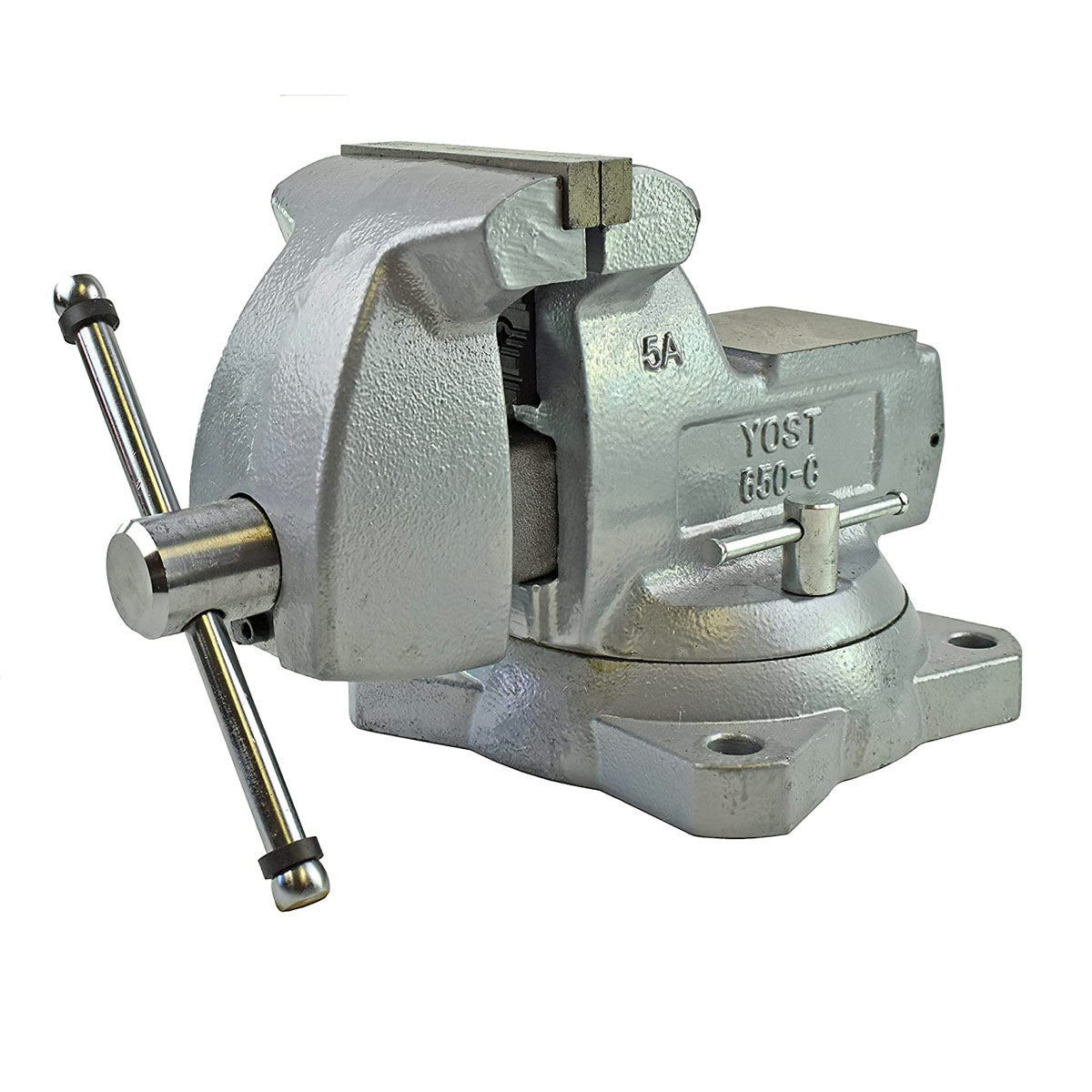 The Yost 650-C Mechanics Vise is made from 30,000 PSI cast grey iron with a tubular steel frame. It has an enclosed lubricated main screw sheltered from the environment. It is equipped with a large anvil work surface as well as replaceable hardened steel serrated top jaws and pipe jaws.