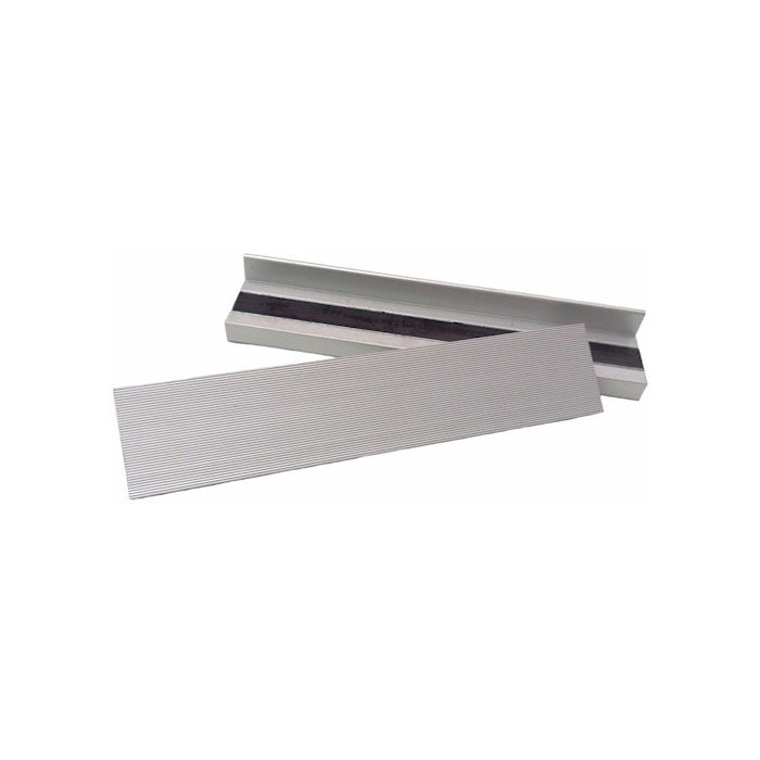 The Yost Vises MA-325 2-1/2" magnetic aluminum vise jaw caps attach to and cover a set of 2-1/2"-wide serrated vise jaws to shield delicate work from damage. The caps are made of aluminum for durability and have a smooth grooved surface that provides enhanced grip while preventing the clamped item from being marred. The magnetic backing runs the full length of the cap to securely bond it to the front of the vise jaw. Two jaw caps are included.