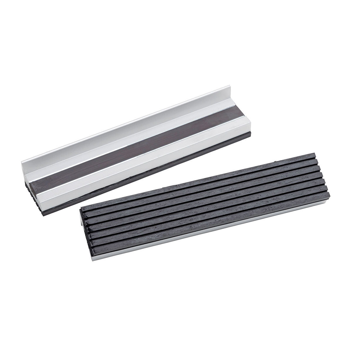 The Yost Vises MR-355 5-1/2" magnetic aluminum vise jaw caps with a rubber surface attach to and cover a set of 5-1/2"-wide serrated vise jaws to shield delicate work from damage. The caps are made of aluminum for durability and have a rubber surface that provides enhanced grip while preventing the clamped item from being marred. The magnetic backing runs the full length of the cap to securely bond it to the front of the vise jaw. Two jaw caps are included.