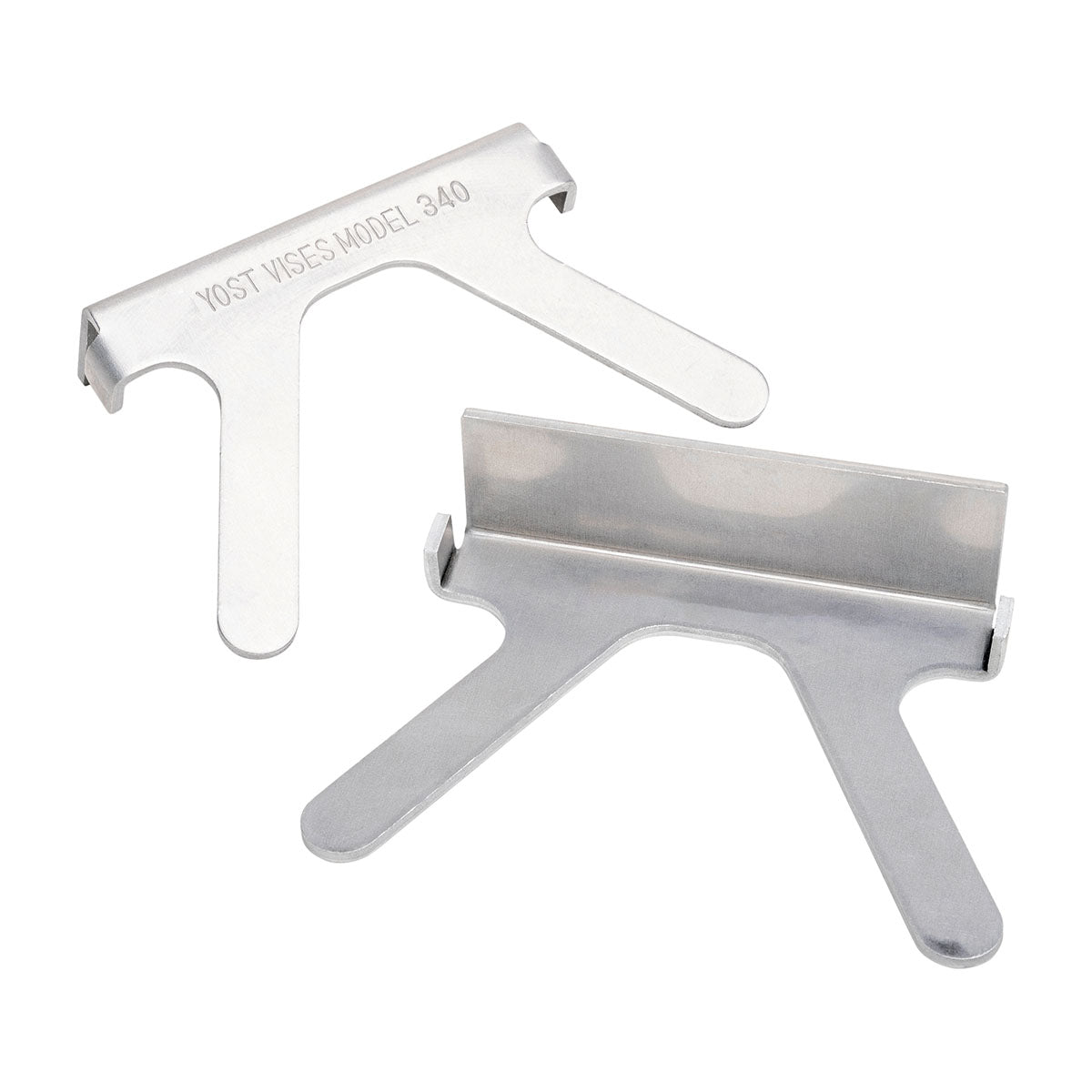 The Yost SA-340 4" aluminum vise jaw caps attach to and cover a set of 4"-wide serrated vise jaws to shield delicate work from damage and meet Federal Specification GGG-C-00137B. The caps are made of aluminum for durability, and the polished finish creates a smooth surface to prevent the clamped item from being marred. Each cap has pliable tangs that fold over the serrated vise jaw to hold the cap in place. Two jaw caps are included.